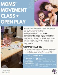 Moms’ Movement Class & Open Play Saturday 01/10/26 Nest & Nook is hosting a Moms Movement class paired with a supervised open play for your